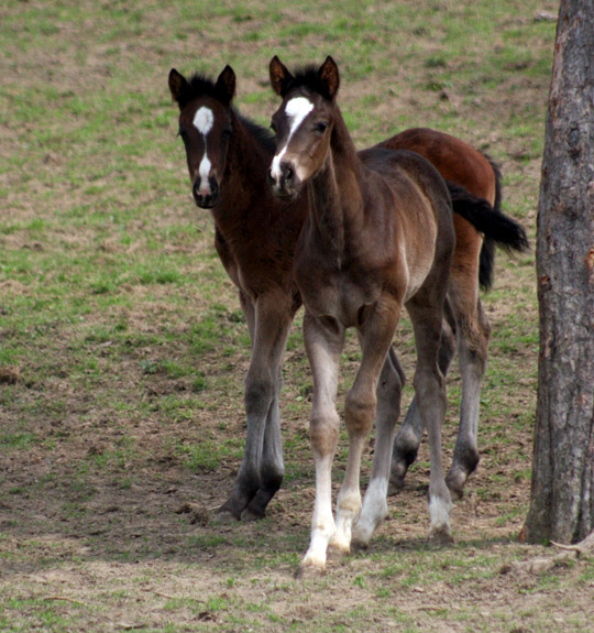 Ontzettend handig als je samen met je moeder in het weiland loopt dat er dan nog een merrie met veulen is zodat er altijd wat te spelen is. Deze twee Kaskinderen wonen in Duitsland. Sinds kort vinden hun moeders het goed dat de kids samen spelen en ravotten. Broertje (uit een Biotop moeder) en zusje (uit een Engels volbloedmoeder) gaan allebei een Trakehner worden maar tot die tijd lekker spelen!!